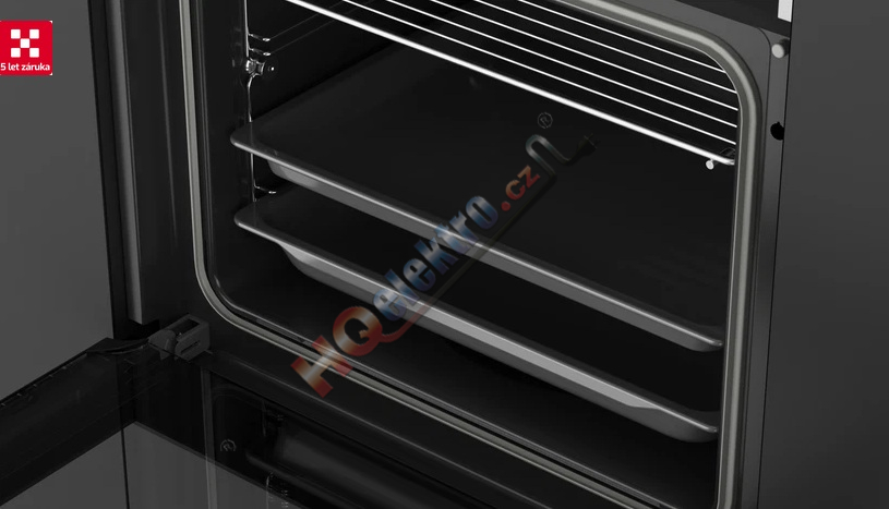 Až 75% odsávání zásobníku pro vyšší komfort a přizpůsobivost. Trouba má chromované podpěry s teleskopickými lištami, které umožňují snadnější vyjmutí plechů a vaření až v pěti výškách.